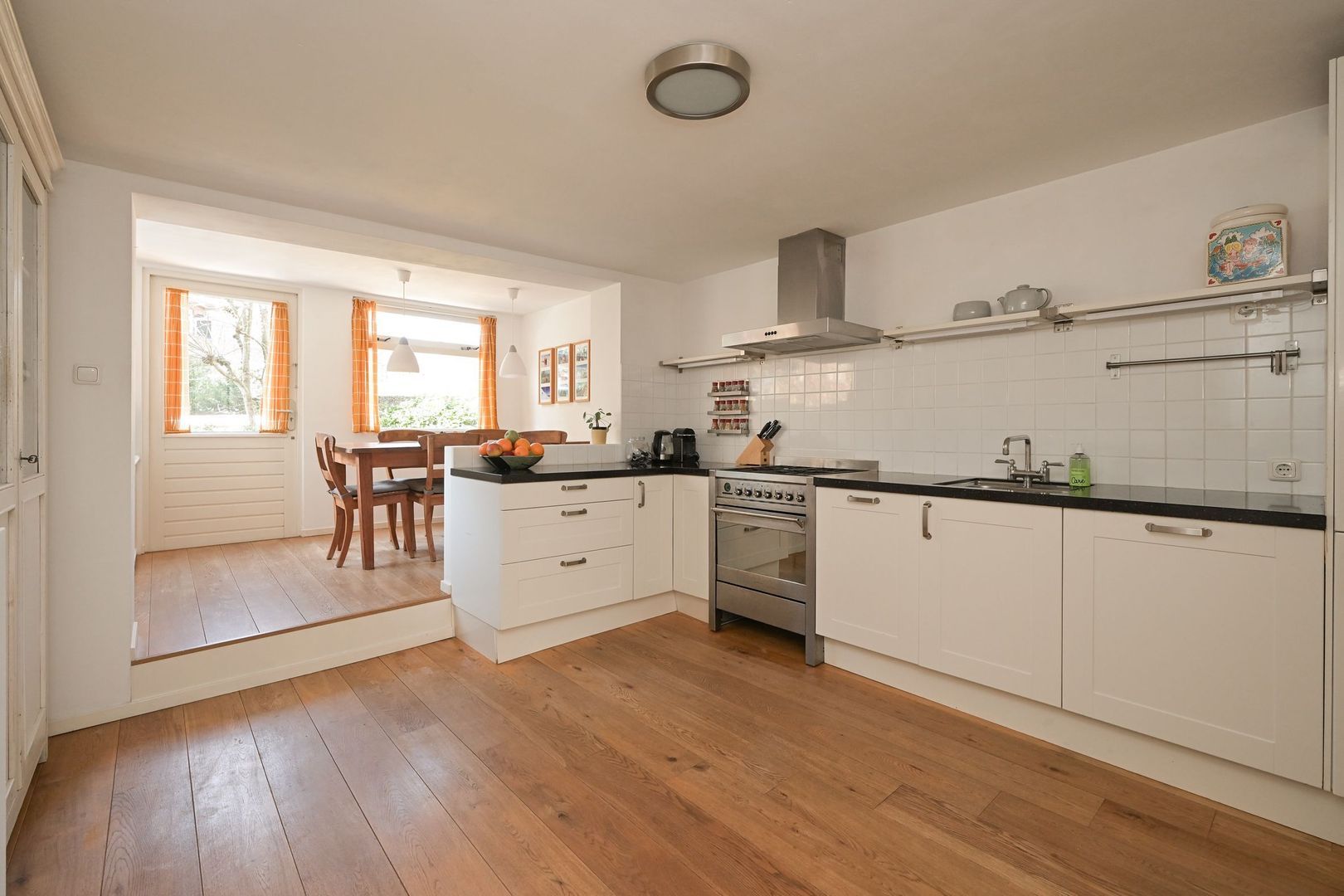 Vanuit de woonkamer leidt een klein trapje omhoog naar de verhoogde keuken, die een open verbinding heeft met de rest van de woning. De keuken geeft toegang tot de eetruimte, met uitzicht op én toegang tot het balkon aan de achterzijde. Vanaf het balkon leidt een trap naar de lagergelegen zonnige tuin. De toegang tot de ruime kelder bevindt zich eveneens op deze verdieping.