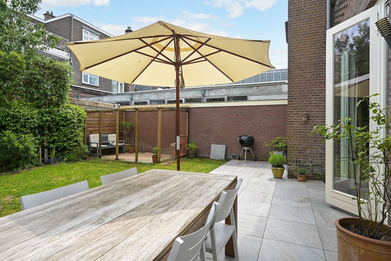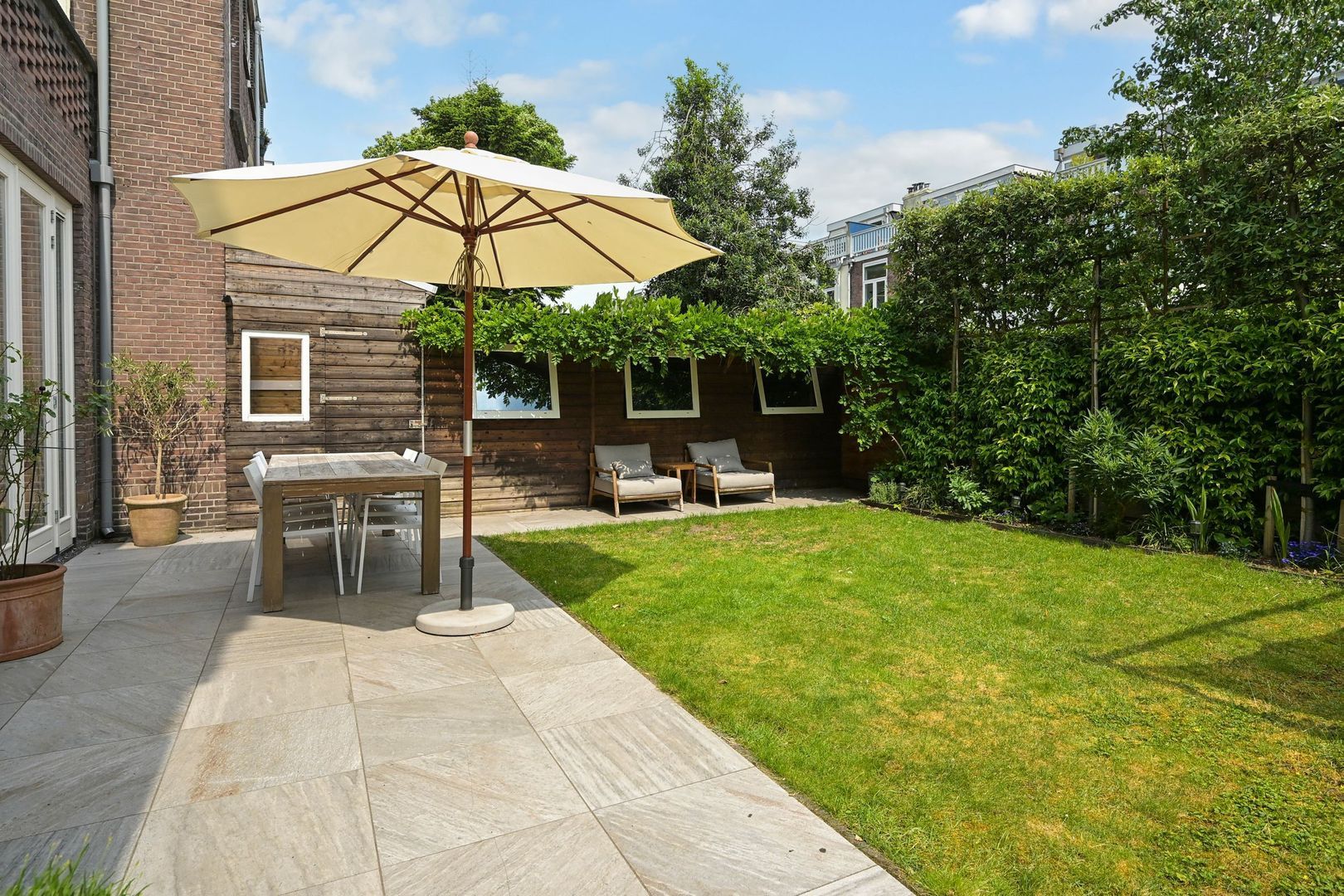 De zonnige achtertuin biedt volop privacy en beschikt over meerdere terrassen. In de tuin bevinden zich een zeer ruime schuur die geschikt is voor opslag of als werkruimte (de vloer is van beton en er is elektra en biedt dus de mogelijkheid om bijvoorbeeld een extra kamer te maken. Aangrenzend aan de woning is een aparte fietsenschuur aanwezig, met directe toegang tot de tuin.