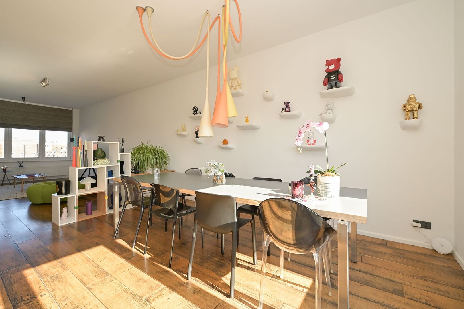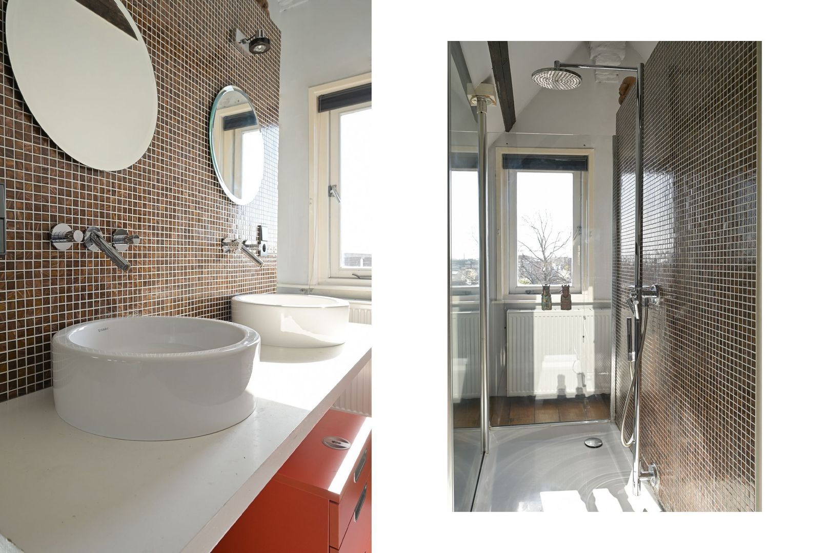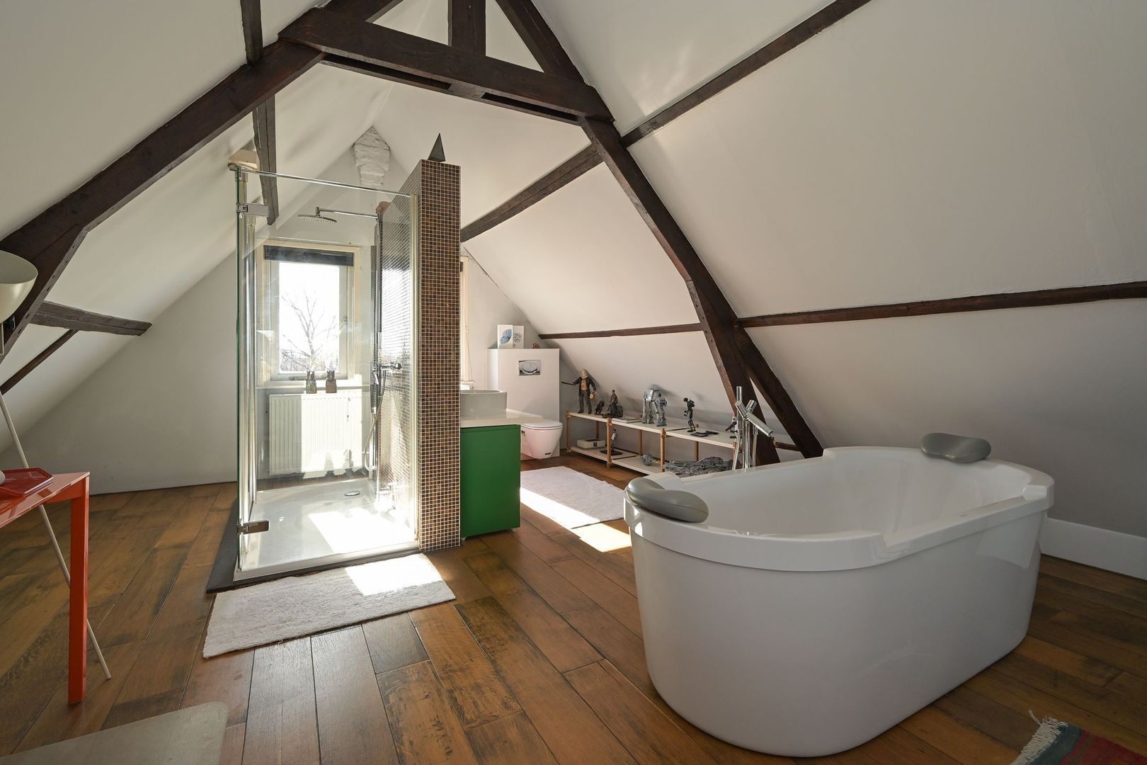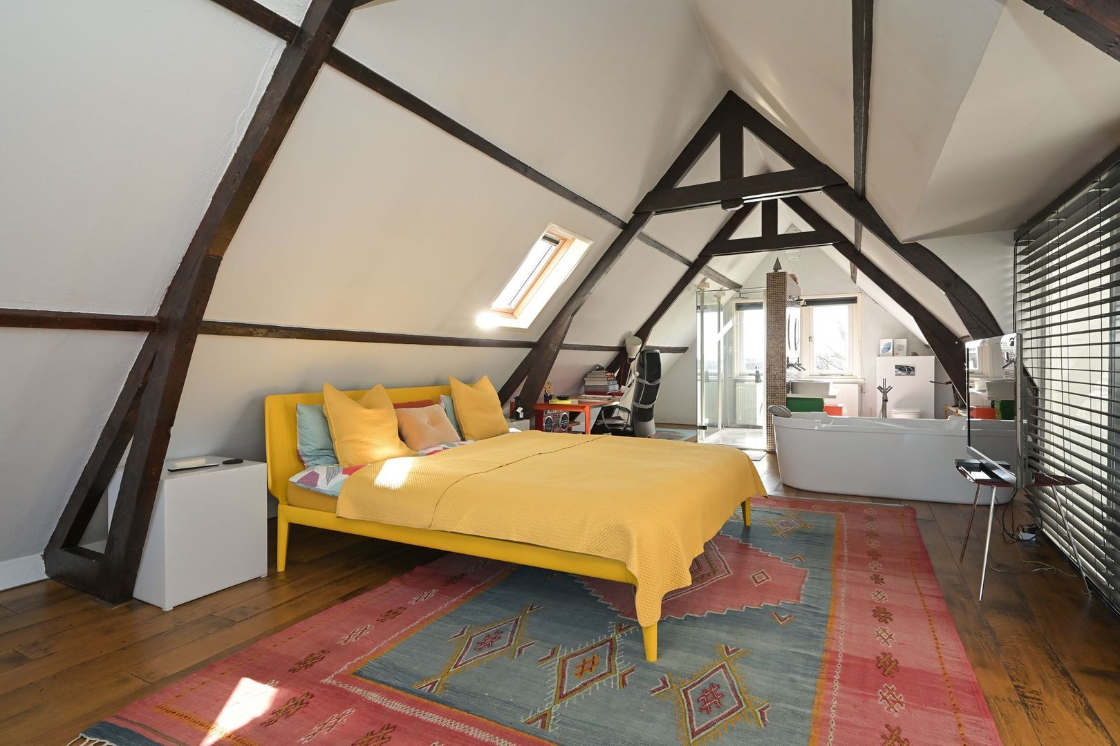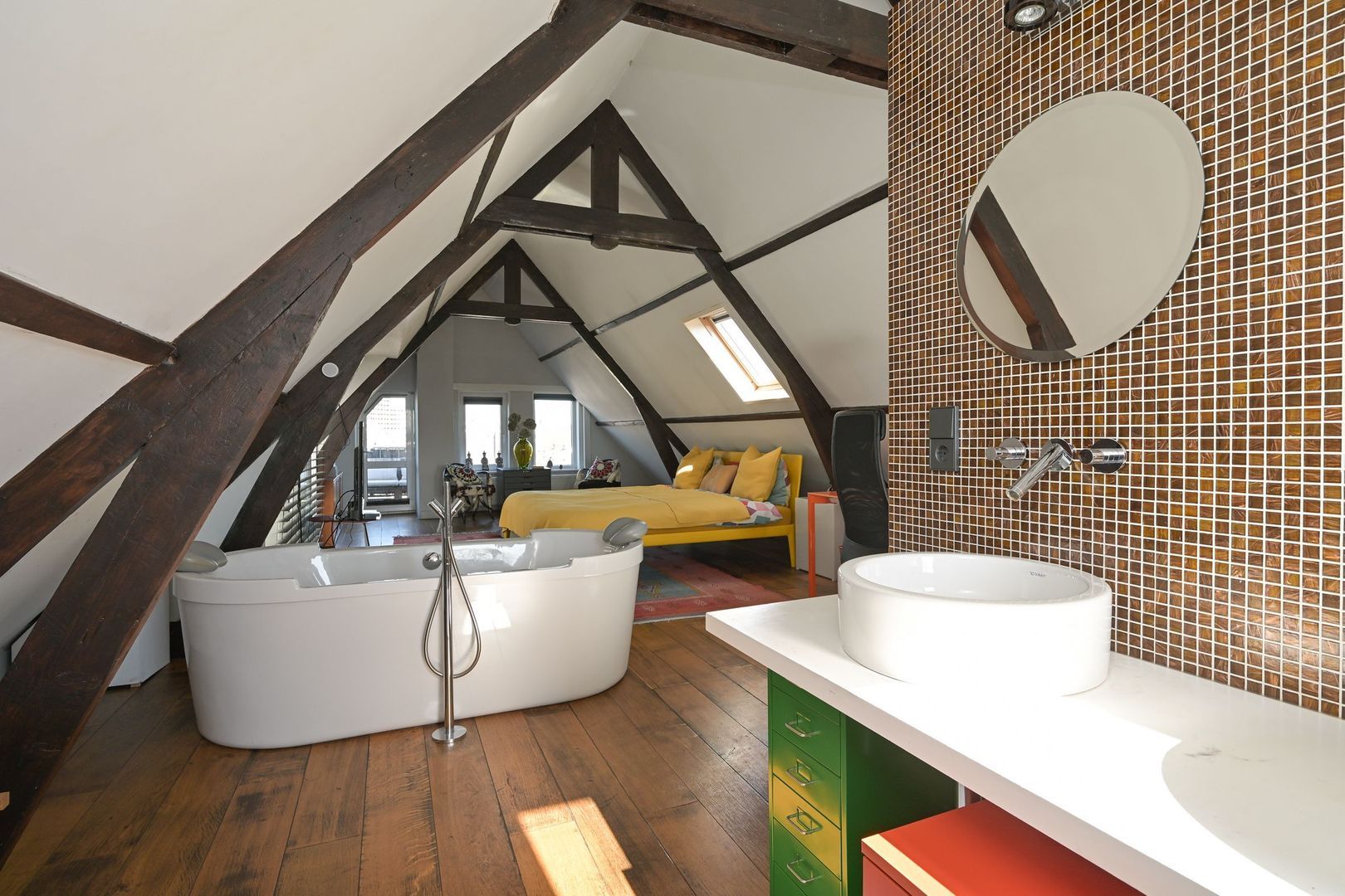 Here, across the entire space, is the master bedroom with bathroom. A unique space with an open bathroom (Philippe Starck) with bath walk-in shower, double sink and toilet. The bedroom has a characteristic roof construction. At the rear again a specious terrace on the southeast with a fantastic view over The Hague.